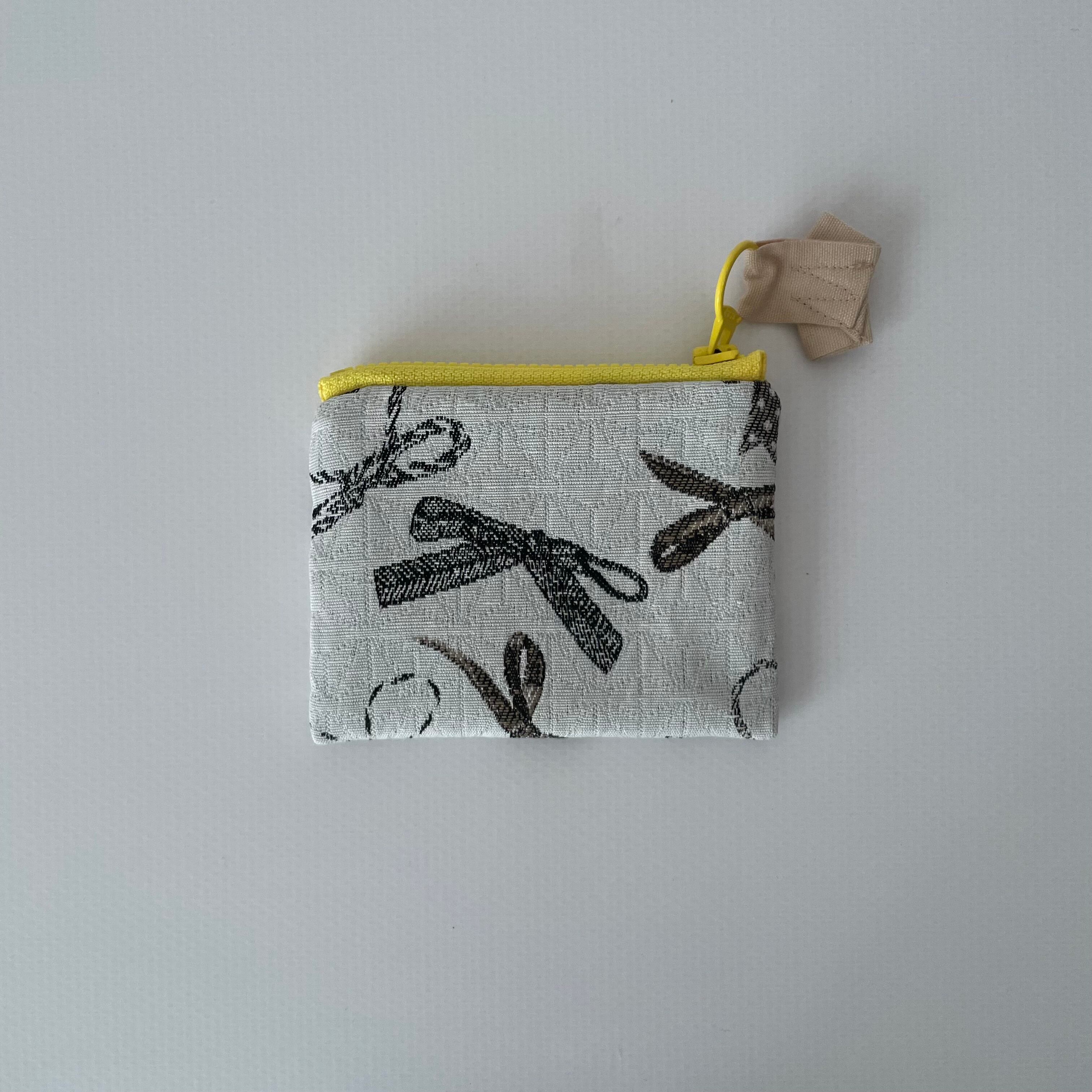 表にはスペインTextiles FRAUPEREZ社製の落ち着いたカラーで上品なリボンがデザインされたジャガード生地を、内には天然色素染NYLONを使用したポーチです。